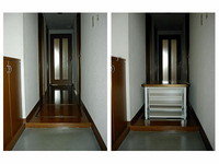 正面が対面キッチンの開口部、その左手、ろうかを挟んだ壁にあるのが、半間幅の収納です。